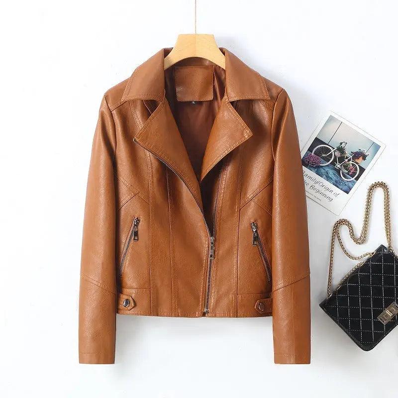 Features: Lapel collar, long regular sleeves, short length, PU leather construction