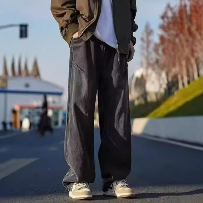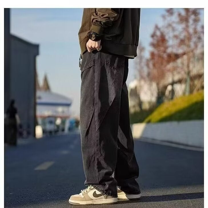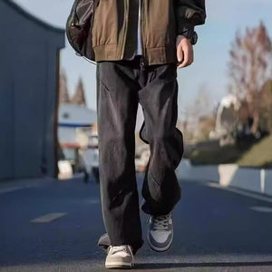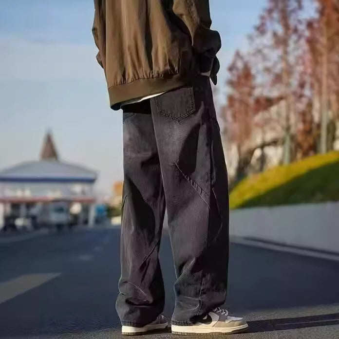 Men’s distressed jeans capture American retro style with this loose straight-leg design, available in blue and black hues, perfect for a rugged, casual look. Crafted from cotton denim with a fold craft for a distressed, pleated effect, these men’s distressed jeans come in S, M, L, XL, 2XL, and 3XL sizes, featuring a drawstring closure without a top fly for a relaxed, modern twist. The straight-leg fit offers a comfortable, laid-back silhouette, making them a versatile choice for everyday wear, streetwear, or casual outings with a vintage-inspired edge. The men’s distressed jeans trend blends nostalgic Americana with contemporary cool, and this cotton pair delivers with its loose fit and distressed detailing that adds character. The blue and black colors keep it timeless, while the drawstring waist ensures easy wear, perfect for pairing with tees or boots for a bold, retro outfit. They’re a wardrobe staple with gritty charm. Step into these men’s distressed jeans—a retro loose stunner that’s all about style and ease. With sizes S to 3XL and a cotton denim build, they’re a fold-crafted gem that elevates any casual look effortlessly.