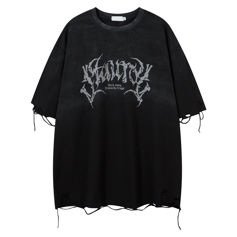 Men’s retro t-shirt styles rock a rugged edge with this tattered loose personality half-sleeve top, featuring a letter pattern in black and gray hues, perfect for summer leisure. Crafted from pure cotton, this men’s retro t-shirt comes in S, M, L, XL, and 2XL sizes, offering a loose pullover fit with short sleeves that’s ideal for warm-weather comfort. The tattered design and jeans-inspired vibe add a bold, casual flair, making it a go-to choice for guys who love a laid-back look with street-ready attitude for daily wear. The men’s retro t-shirt trend blends vintage cool with modern ease, and this cotton piece delivers with its loose silhouette and letter print that channels a distressed, denim-like charm. The black and gray colors keep it versatile, while the short sleeves ensure breathability, perfect for pairing with shorts or jeans. It’s a summer staple with a gritty edge. Slip into this men’s retro t-shirt—a tattered loose stunner that’s all about style and chill. With sizes S to 2XL and a pure cotton build, it’s a lettered gem that elevates any casual vibe effortlessly.