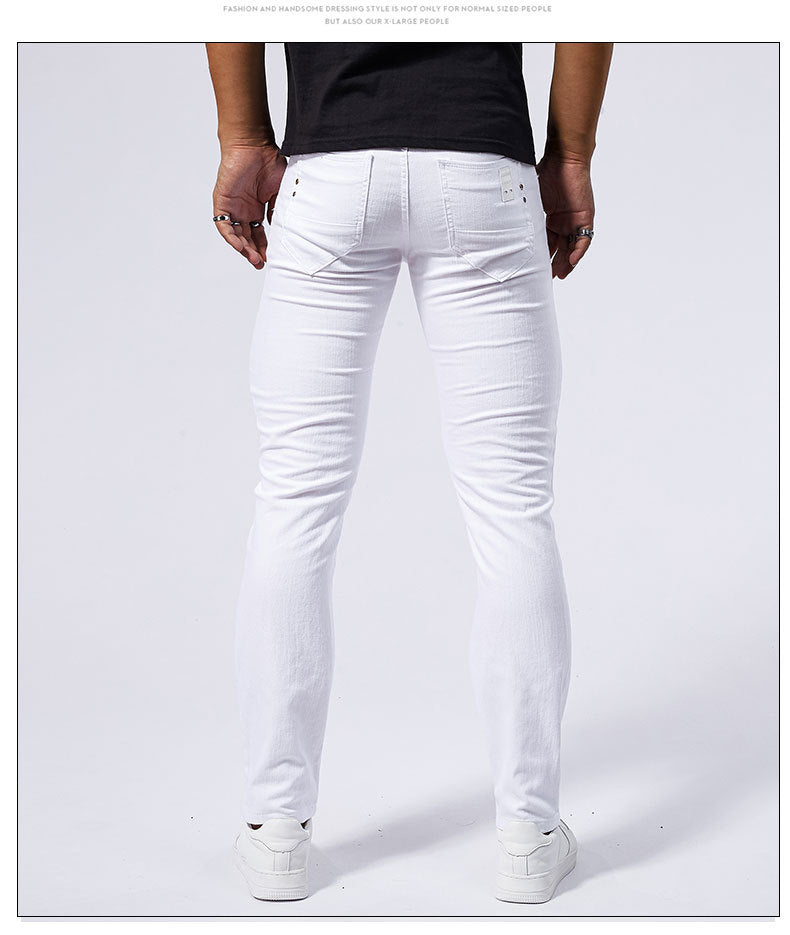 Men's White Stretch Skinny Jeans are a sleek and modern choice for casual wear. Made from high-quality denim with a cotton blend, these jeans feature a pure white color and micro elasticity, ensuring a comfortable and snug fit. The mid-waist design and zipper fly add a polished and practical touch, making them perfect for leisure outings or daily wear.