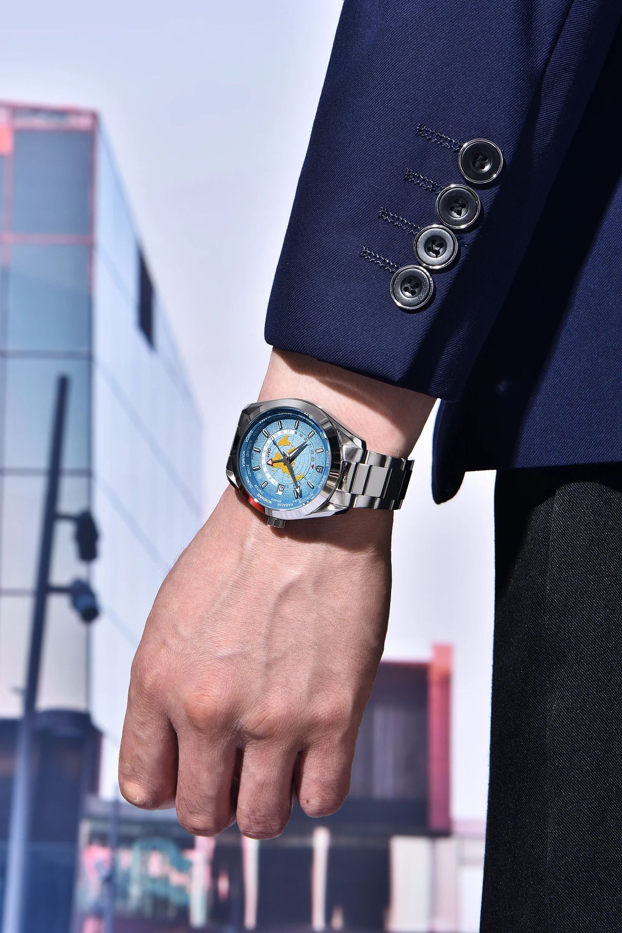 Available in blue, light blue, and black, this watch features a 40mm dial diameter and 14mm thickness, providing a bold and sophisticated look. The single folding buckle ensures a secure and comfortable fit, making it ideal for daily wear or formal occasions.