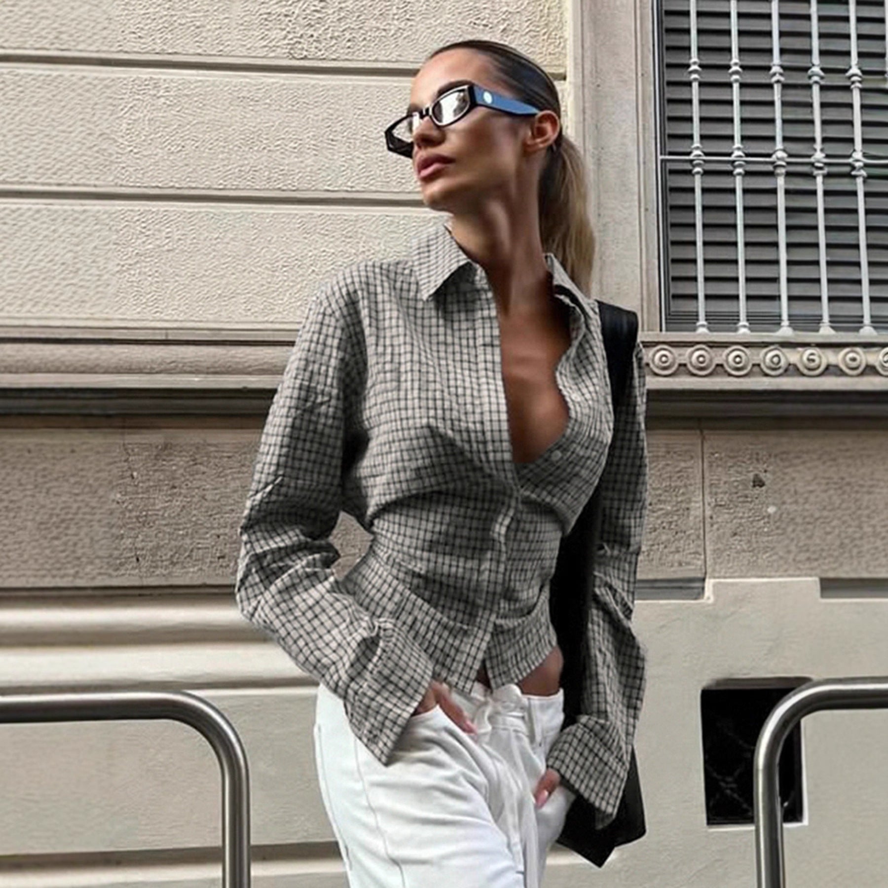 Retro Plaid Tie-Waist Long Sleeve Shirt