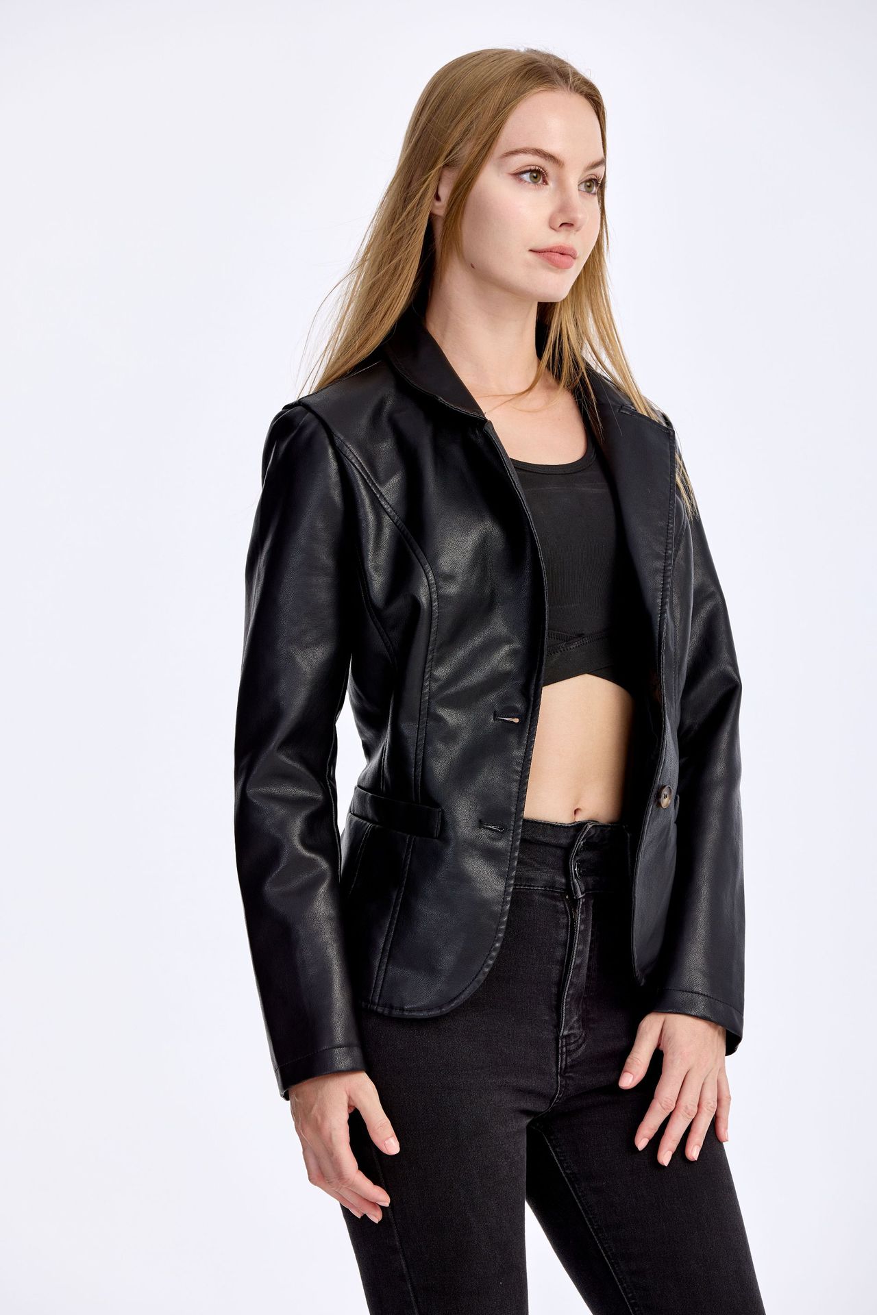 Craftsmanship: Precision slim tailoring with clean seams, twisted decorative buttons and functional zippered pockets