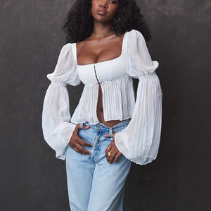 Details: Square collar, bell sleeves, pleated work clothes stitching, sheer finish