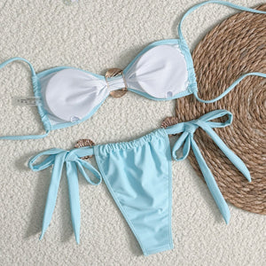Features: High waist, briefs-style bottom, sleeveless, lace-up detailing, metallic shell accents, solid color pattern