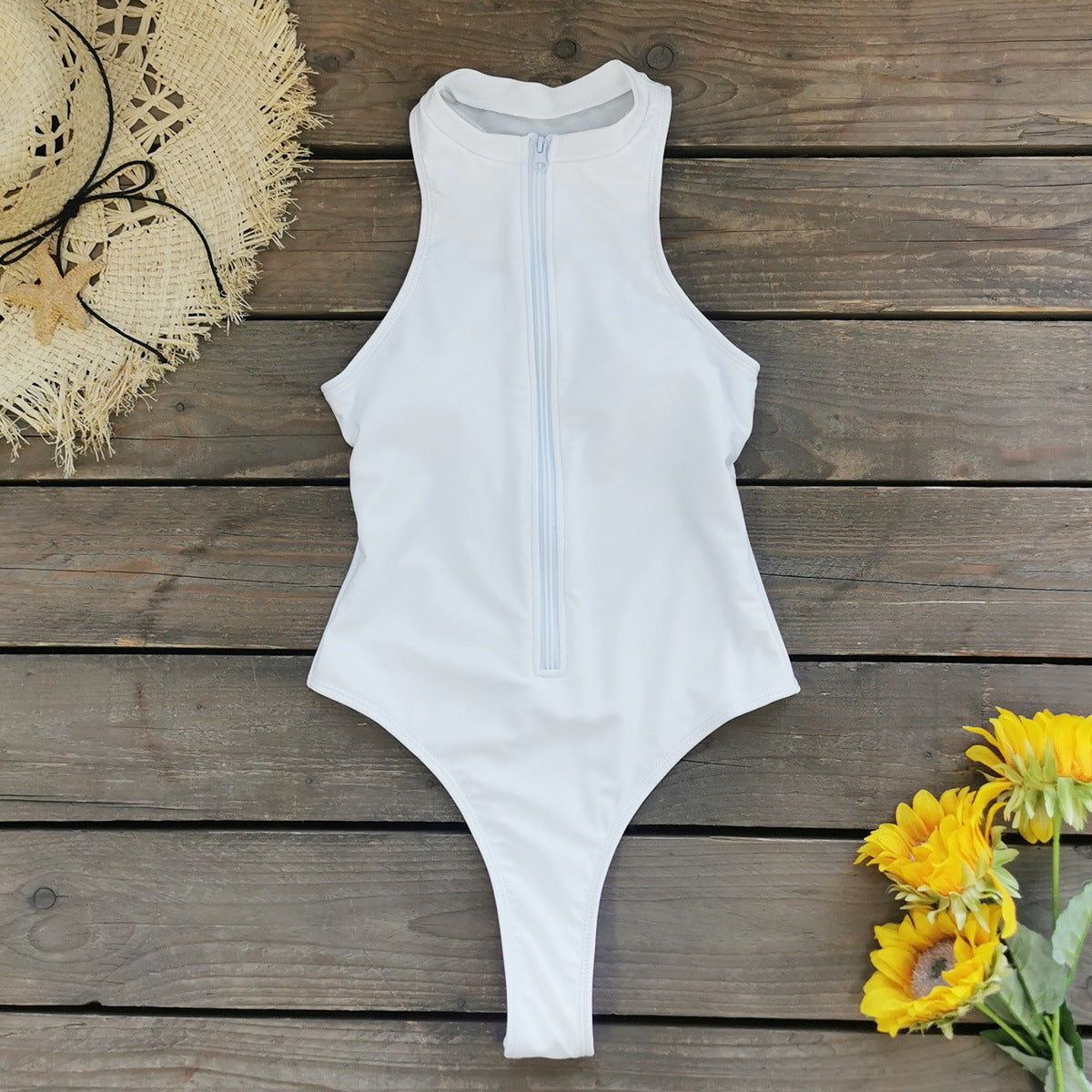 name: women’s one-piece swimsuit – solid color sleeveless tight zipper triangle design